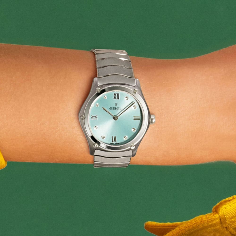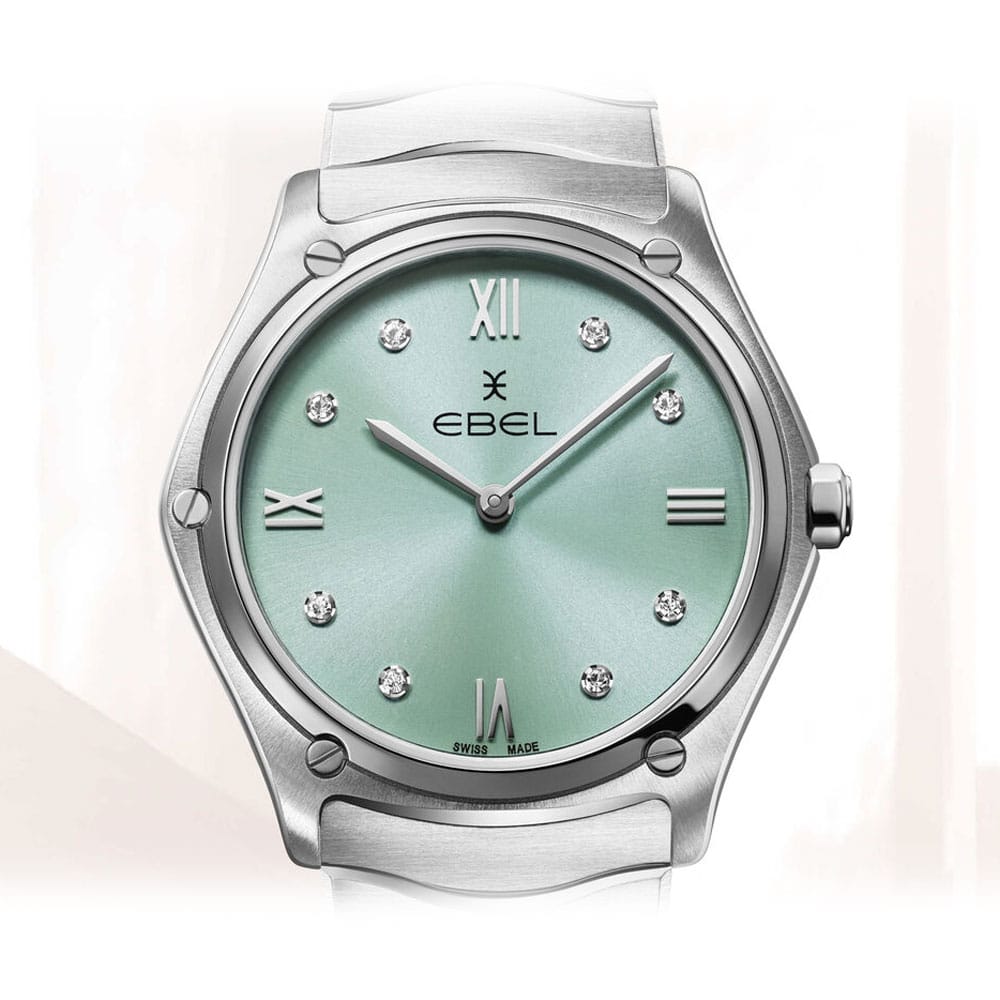 Diese Uhr hat ein 33mm Gehäuse. Das verwendete Material ist Edelstahl, für Gehäuse und Armband. Das galvanisierte, mintblaue Zifferblatt ist besetzt mit 8 Diamanten. Zur Anwendung kommt ein zuverlässiges Schweizer Quartz-Werk. Informieren Sie sich bitte ausreichend über diese Uhren. Sowohl Damen, als auch Herren können bei der Ebel Sport Classic etwas finden. Auch lohnt sich ein Blick zu ähnlichen Damenuhren in der Ebel Lady Kollektion, Wave oder Mini.