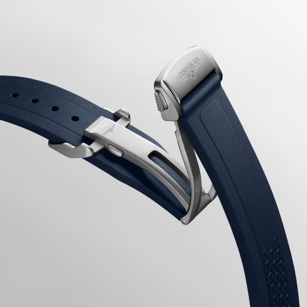 - blaues Kautschukarmband, Faltschließe, Bandanstoß 19mm