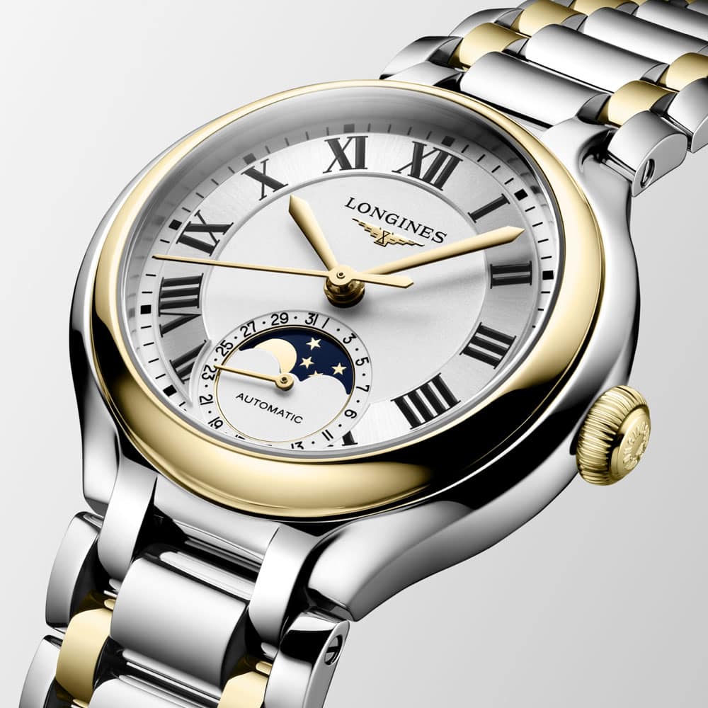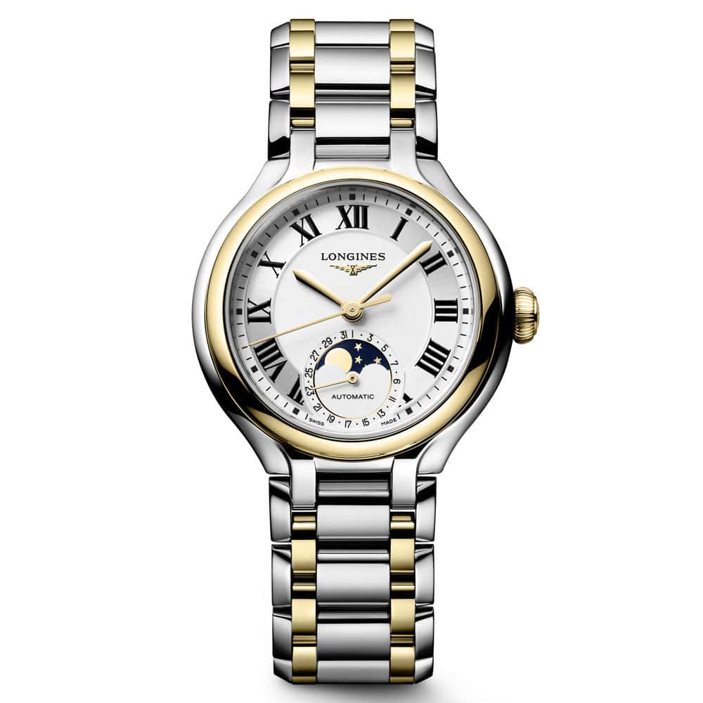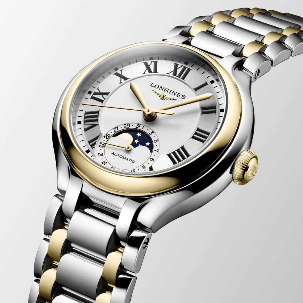 Die Kollektion „PrimaLuna“ von Longines verkörpert Eleganz und Weiblichkeit. Sie strahlt eine Schönheit aus, die über flüchtige Trends hinausgeht. Der himmlische Einfluss spiegelt sich in den anmutigen Kurven und den zarten Linien wider, die mit viel Liebe zum Detail gefertigt wurden. Das hier vorgestellte Modell hat ein 34mm Gehäuse. Das mechanische Automatikwerk L899 ermöglicht eine Gangreserve von ca. 72 Stunden. Das verwendete Material ist Bicolor, Edelstahl mit 18 Karat Gelbgold.