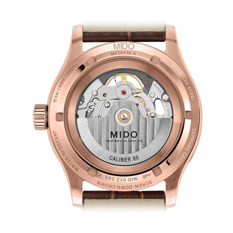 - Werk: mechanisches Automatik Werk Mido Caliber 80, Basis ETA C07.631, Gangreserve bis zu 80 Stunden, Nivachron™-Spiralfeder