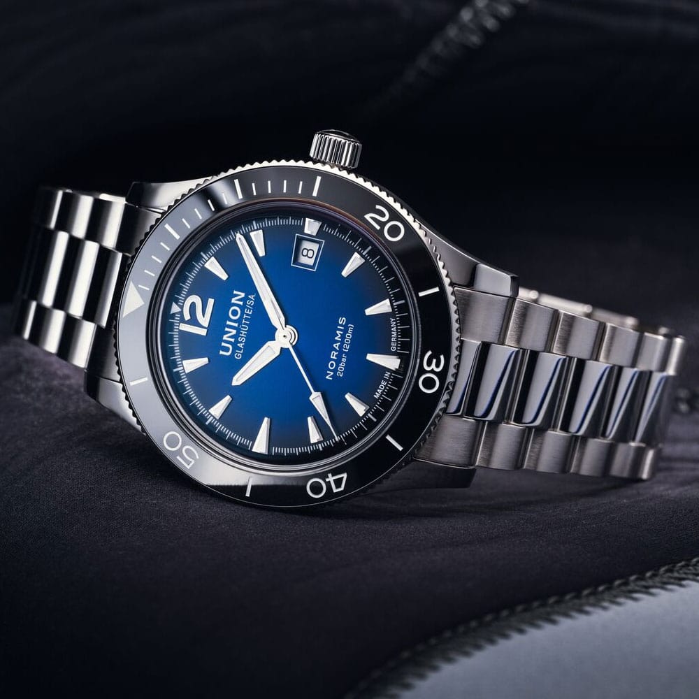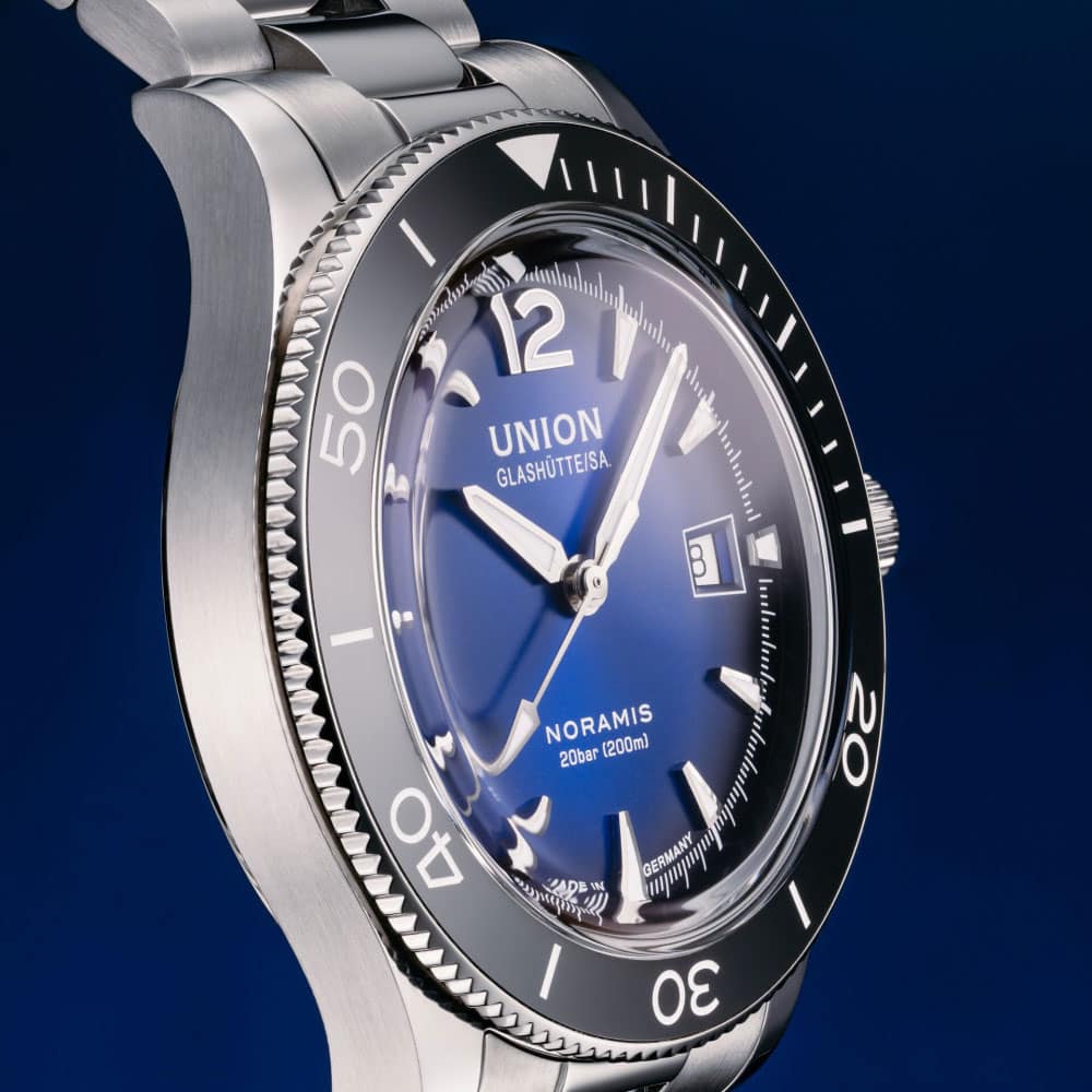 Es freut uns, dass Sie sich Zeit nehmen, für diese Union Glashütte Noramis Datum Sport D012.907.11.047.02. Das hier vorgestellte Modell gehört zur Kollektion Noramis. In der Variante Sport Datum hat sie so einige, beachtenswerte Feinheiten zu bieten. Das 42mm Gehäuse ist zum einen poliert, wurde aber zusätzlich an den Flanken satiniert. Das Saphirglas ist auffällig stark gewölbt. Die markante Lünette wurde aus Keramik gefertigt. Durch diese Kombination erhält die Noramis Datum Sport ein unverwechselbares Aussehen. Dank der verschraubten Krone und dem verschraubten Boden werden 20 bar Wasserdichte erreicht. Ausgestattet ist die Uhr mit einem massiven Edelstahlband.